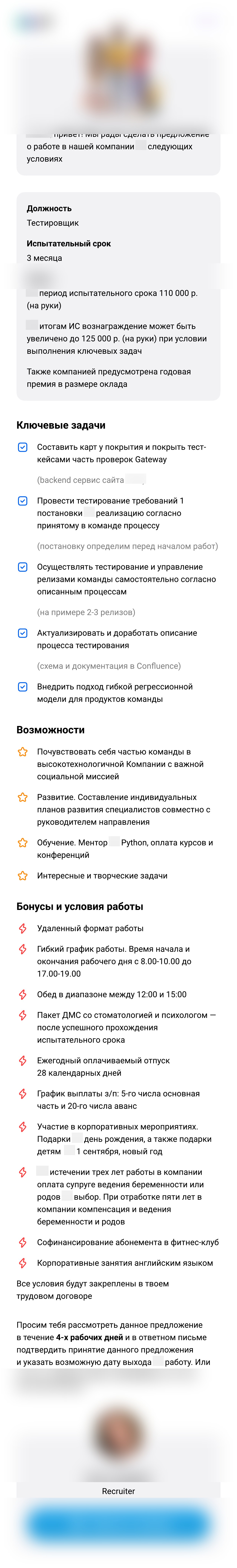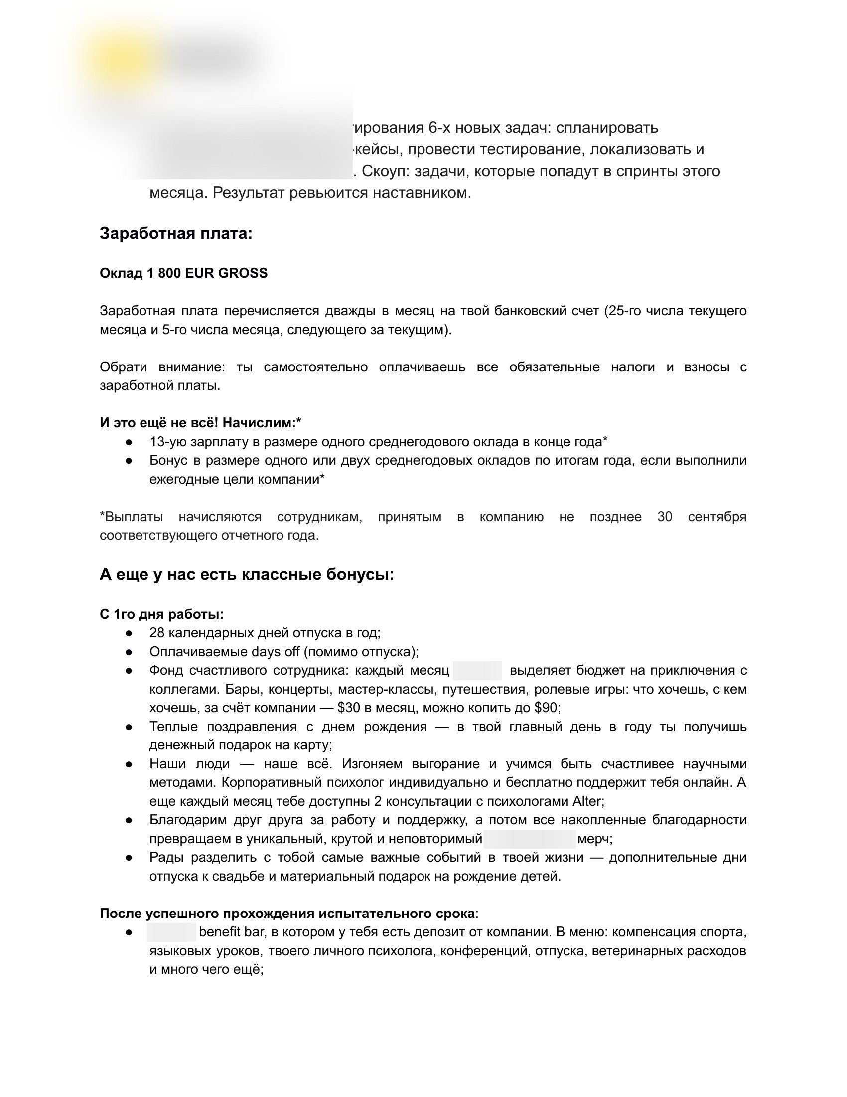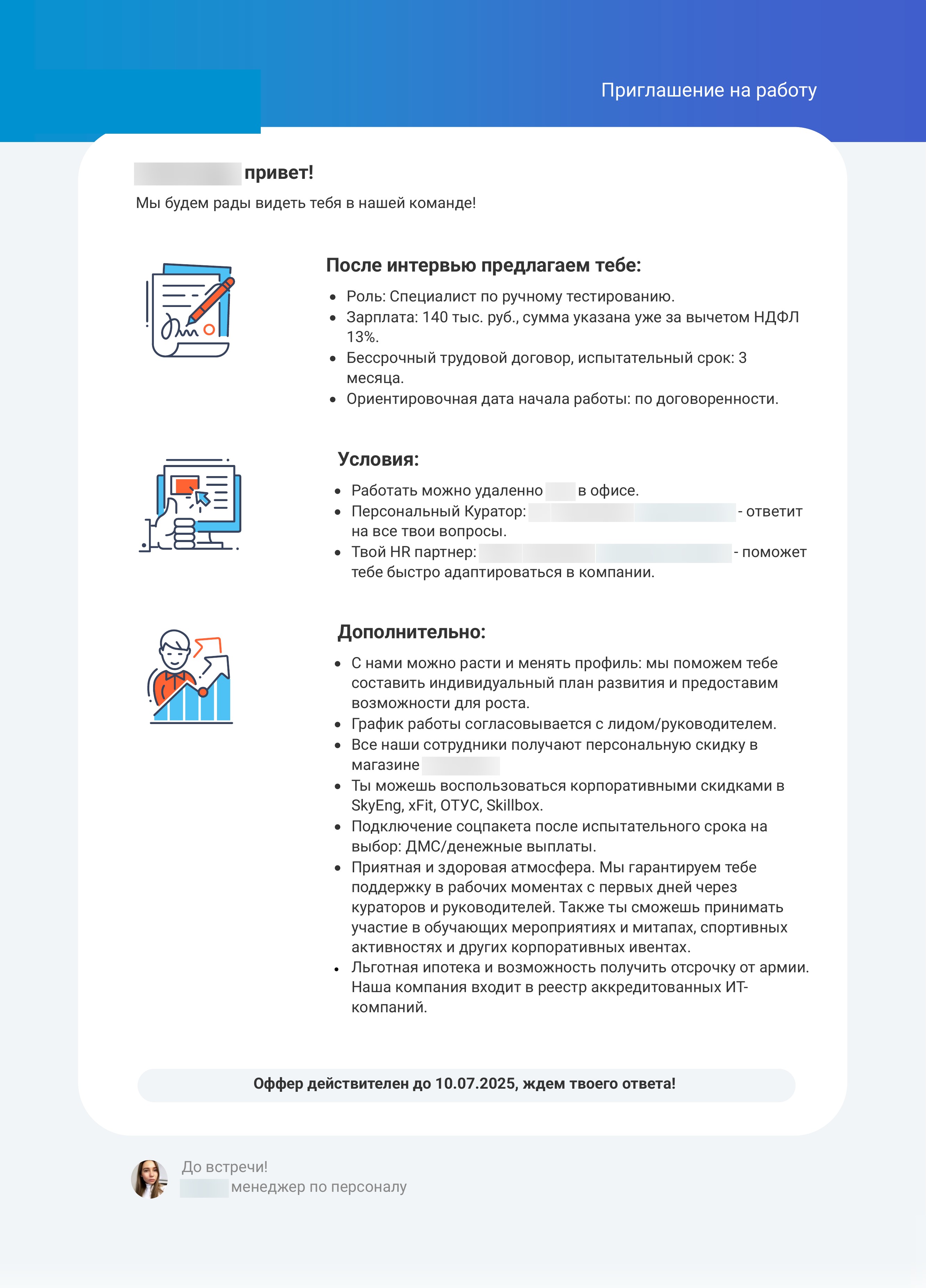 Не ограничен легендой и мотивацией, а сопровождает тебя до конца испытательного срока по всем фронтам. Наша мотивация привязана к концу испыталки, а не получению оффера