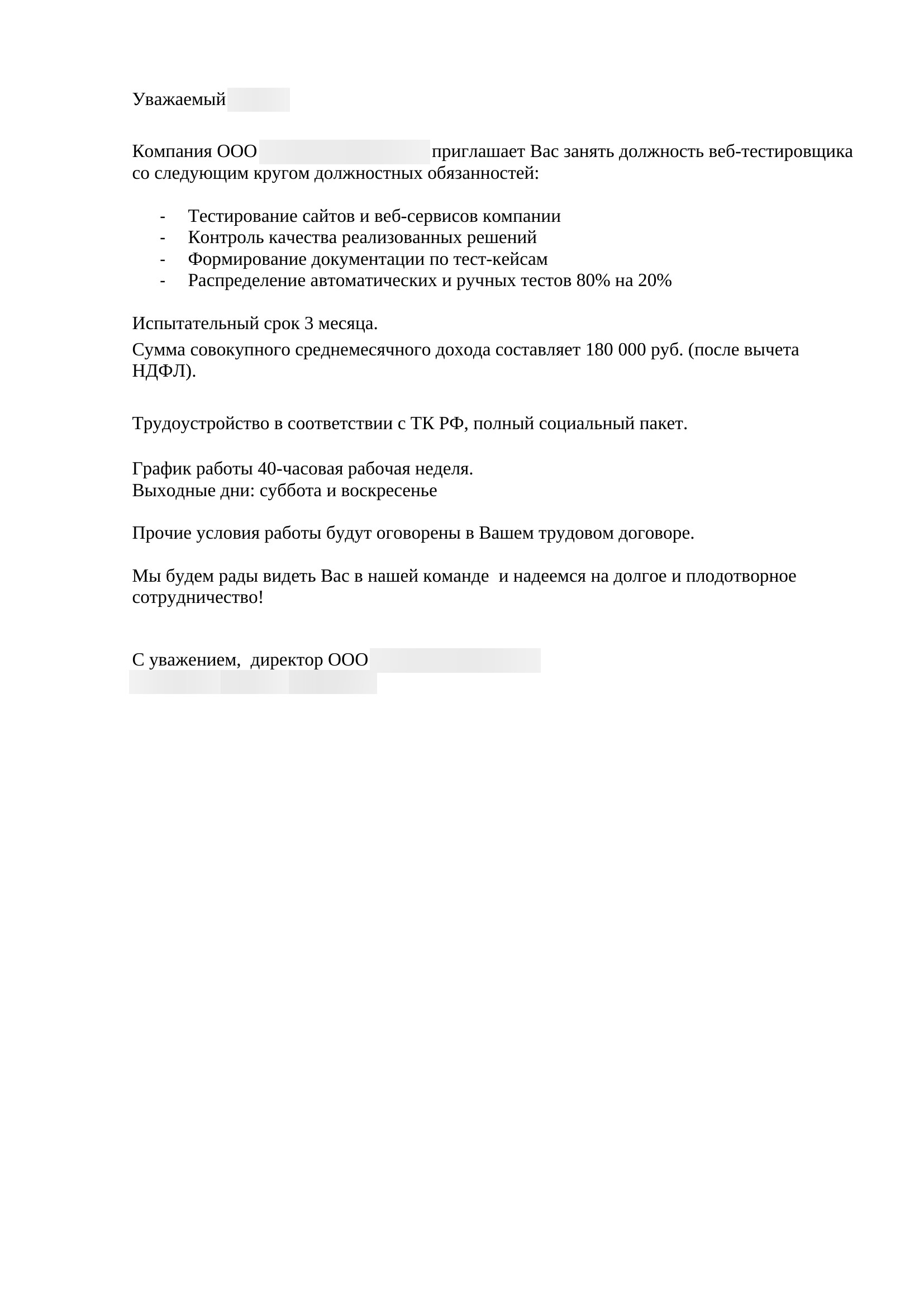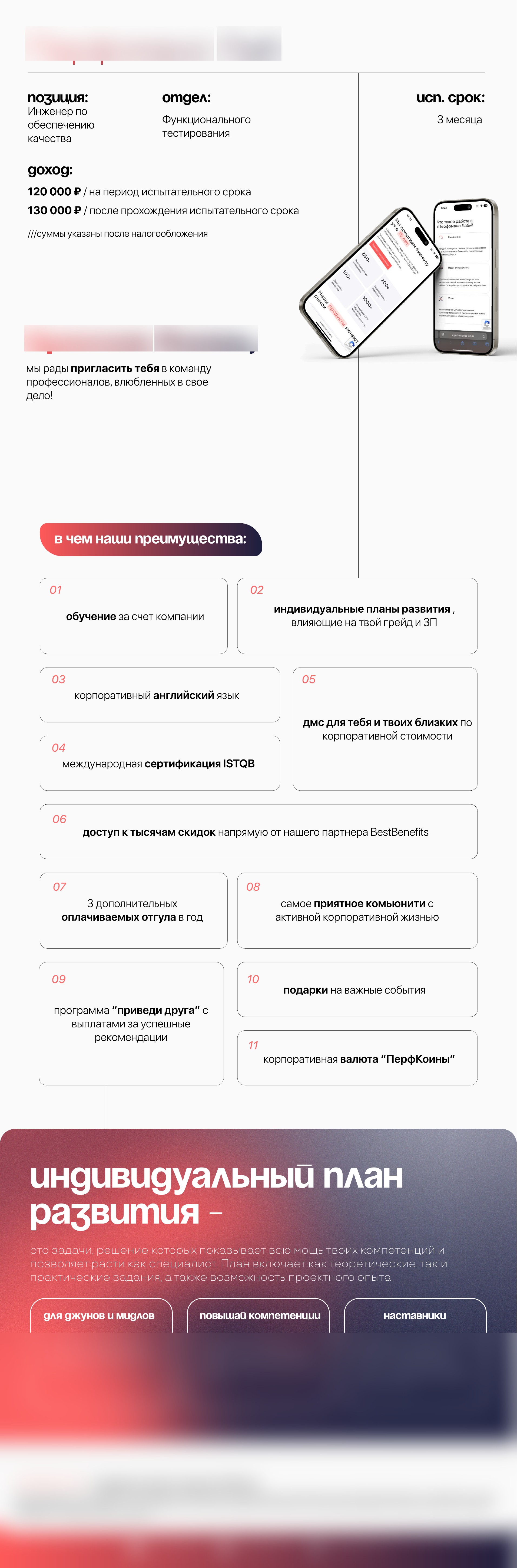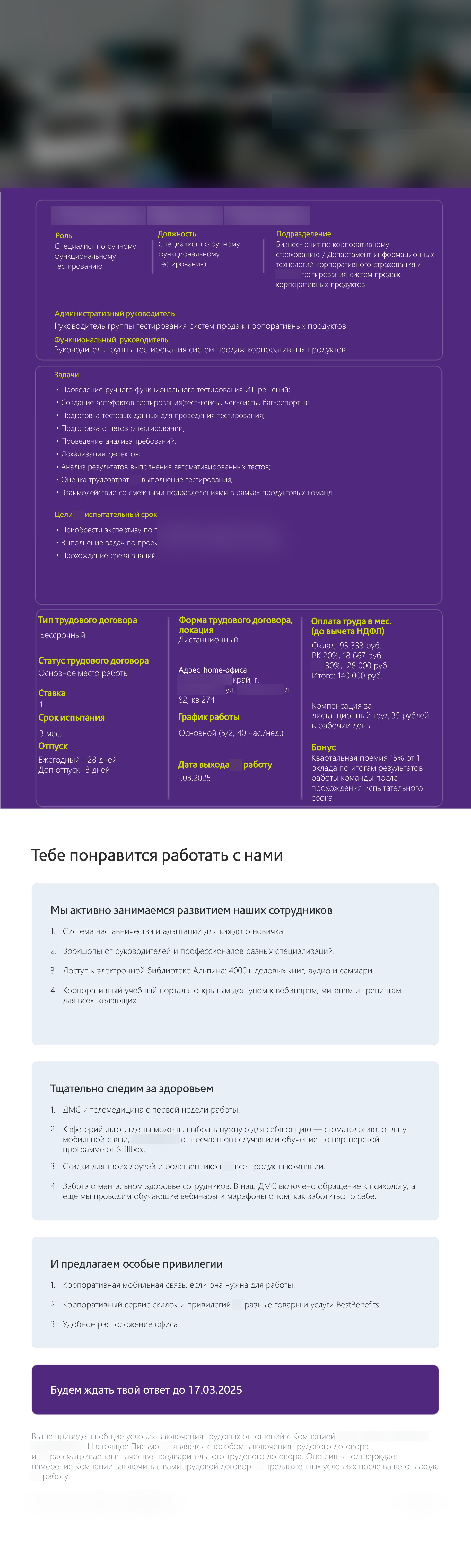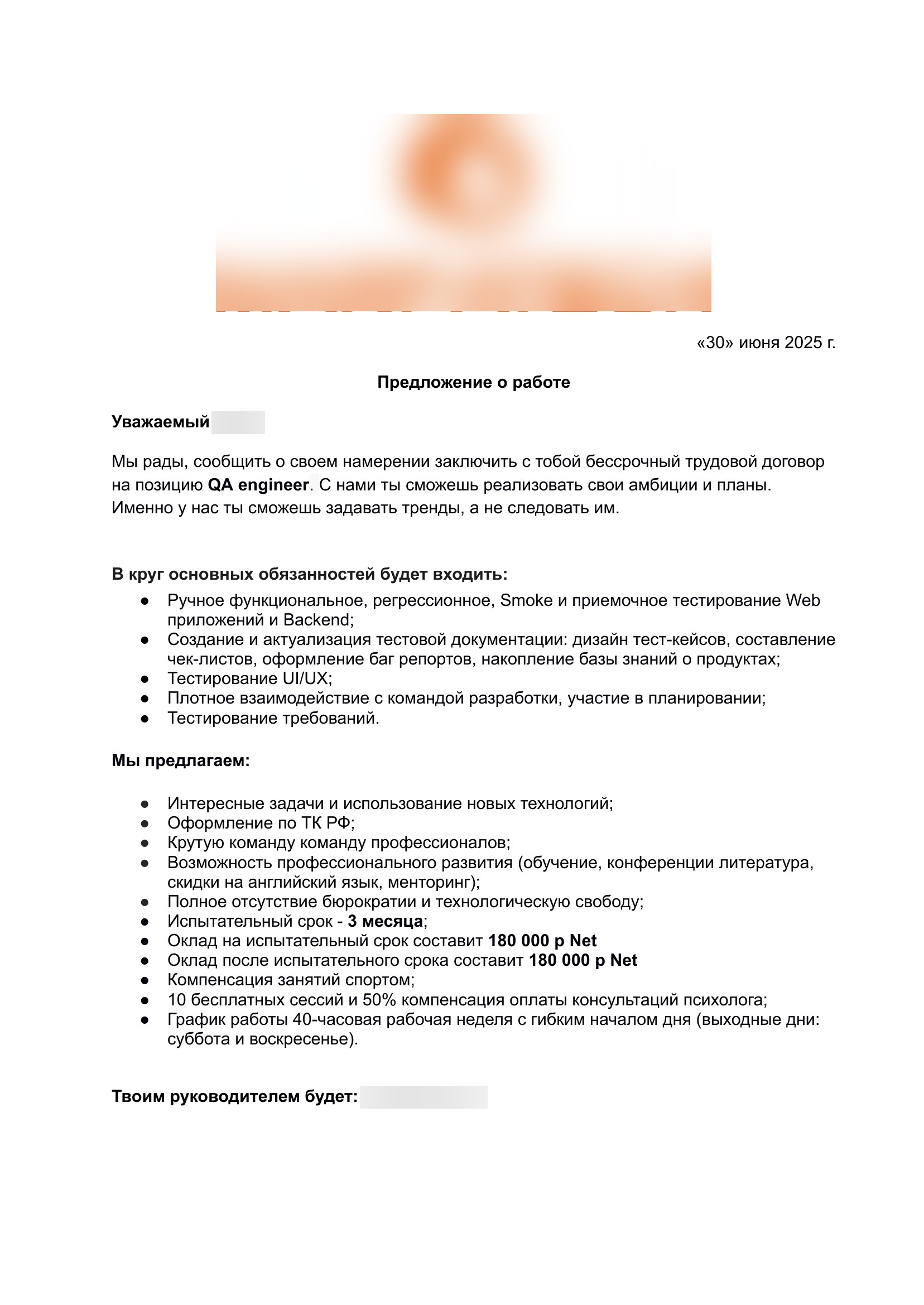 Не ограничен легендой и мотивацией, а сопровождает тебя до конца испытательного срока по всем фронтам. Наша мотивация привязана к концу испыталки, а не получению оффера